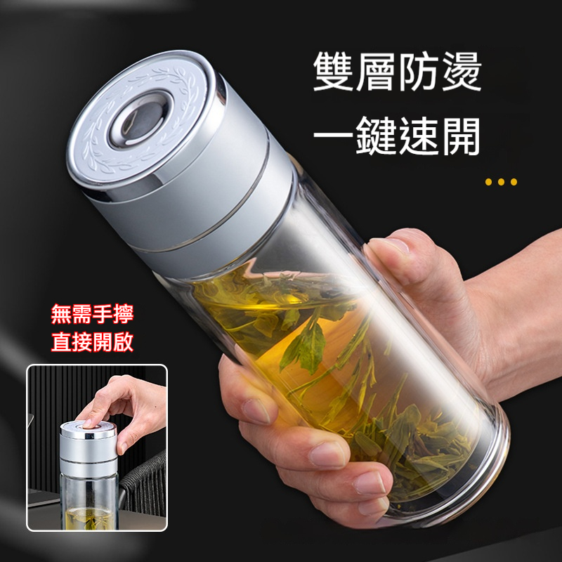 【雙層玻璃速開保溫杯】將「單手一秒開蓋」與「雙層防漏」完美結合!✨高硼硅玻璃、磁控開蓋、茶水分離設計,讓行車飲水與辦公泡茶皆從容不迫✨